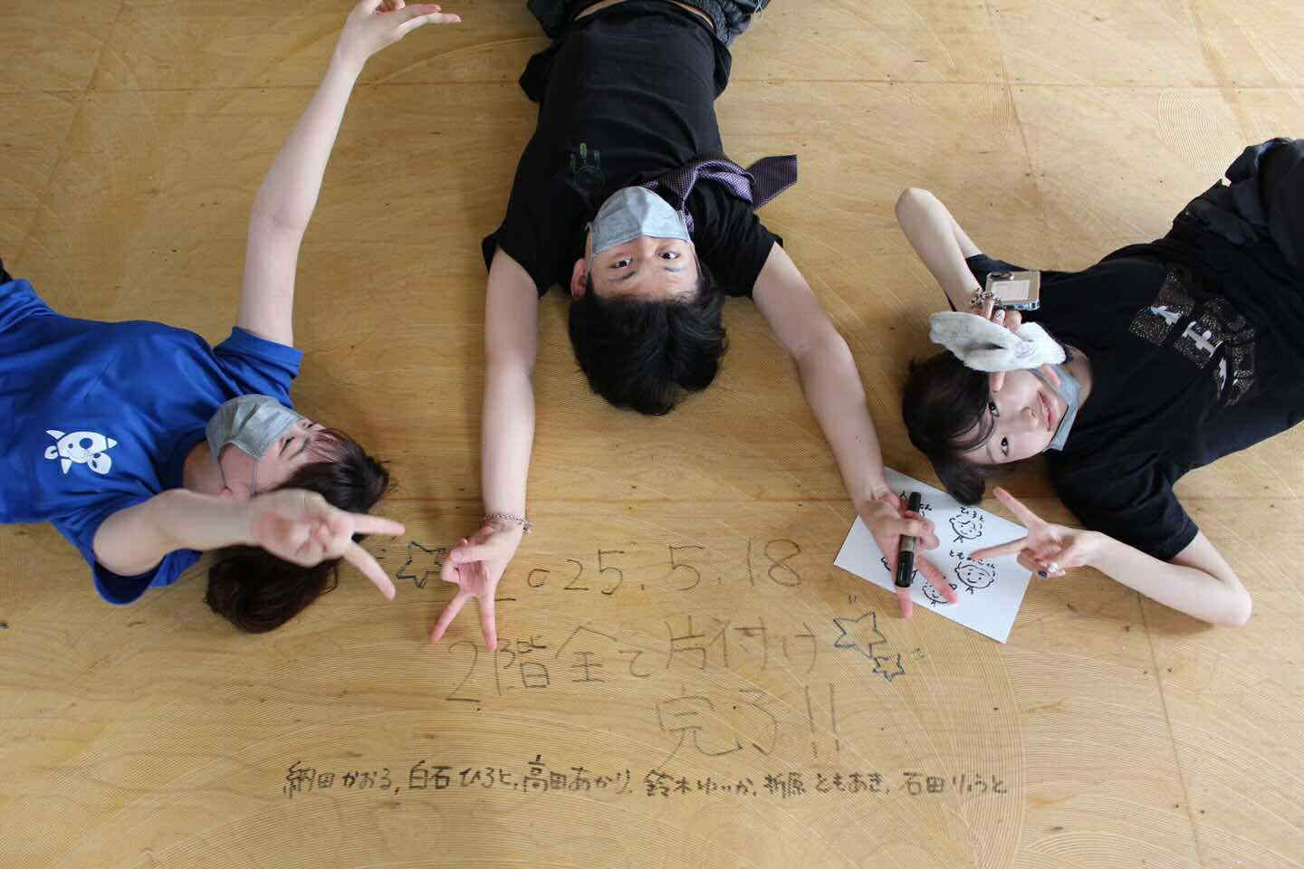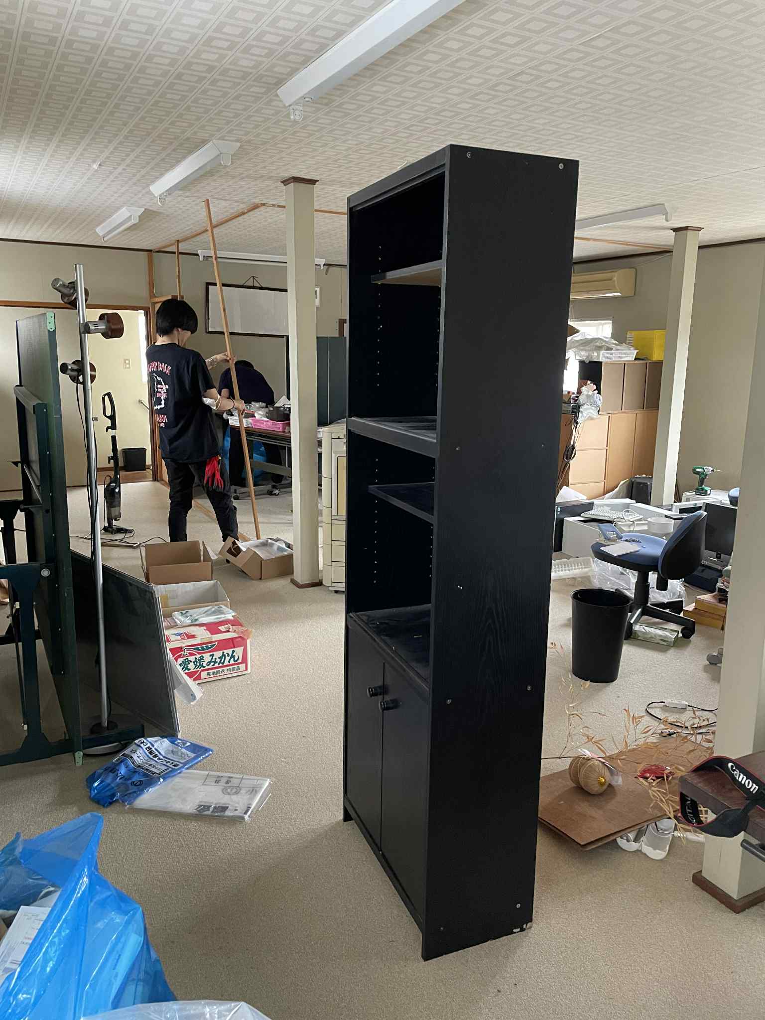 武蔵野大学の学生や県内の建築学部の学生が集まり2階部分の事務用品や家具などの撤去作業を行いました。同じくパーティションや床のカーペットも撤去しました。人手で下ろせない大きな家具などは重機を使って下ろしました。広々としたワンフロアが現れて、これからどうしていくのかプランニングに夢が広がります。