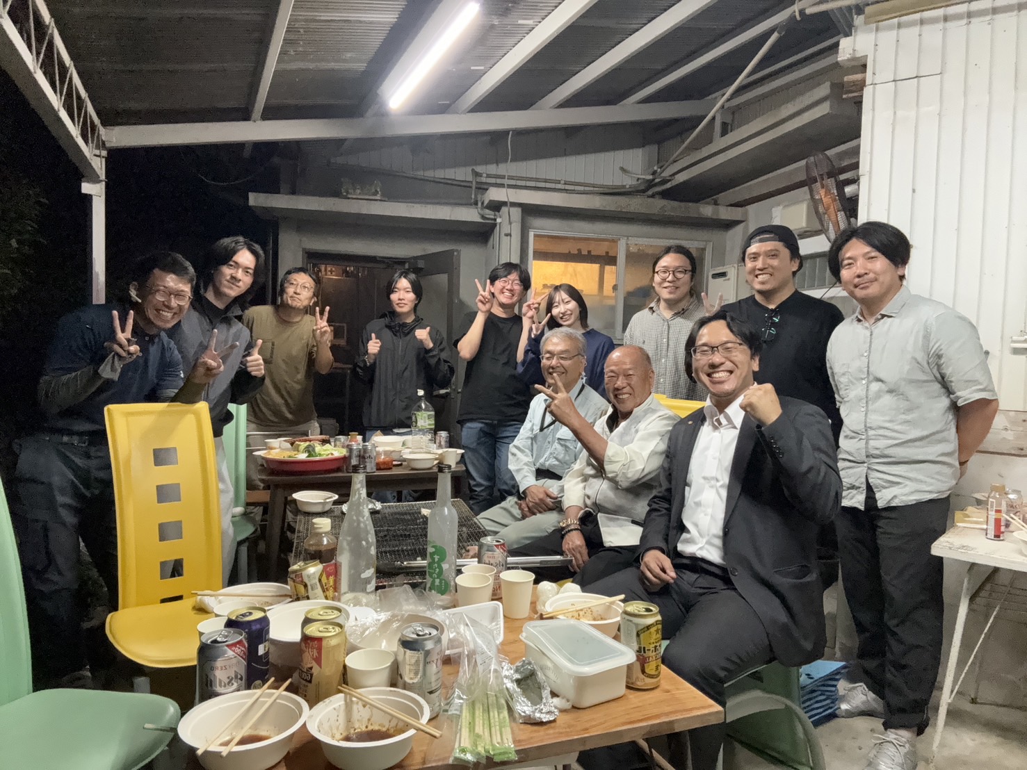 前回床材を剥がしたところに今回は新しく地元の杉の無垢板を貼ることにしました。今回の大学生の活動を知った地元の建築士会の長老?が感銘を受け「ぜひ彼らと話をしてみたい」とお声がかかり、BBQパーティーを開催してくれ、参加し地元の建築士とも交流して夜遅くまで話が弾み楽しい会となりました。